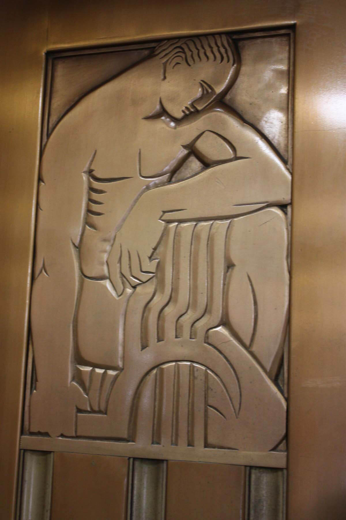 In 1931 the architectural firm of Buckley and Skidmore hired Iannelli to create the doors for City Hall. Iannelli combined the geometrically simplified workers, a trademark seen in the “sprite sculptures” and the Adler Planetarium plaques with Art