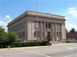 - All-limestone building built in the Neo-Classical architectural style incorporates fluted and modified corinthian columns and classical details.