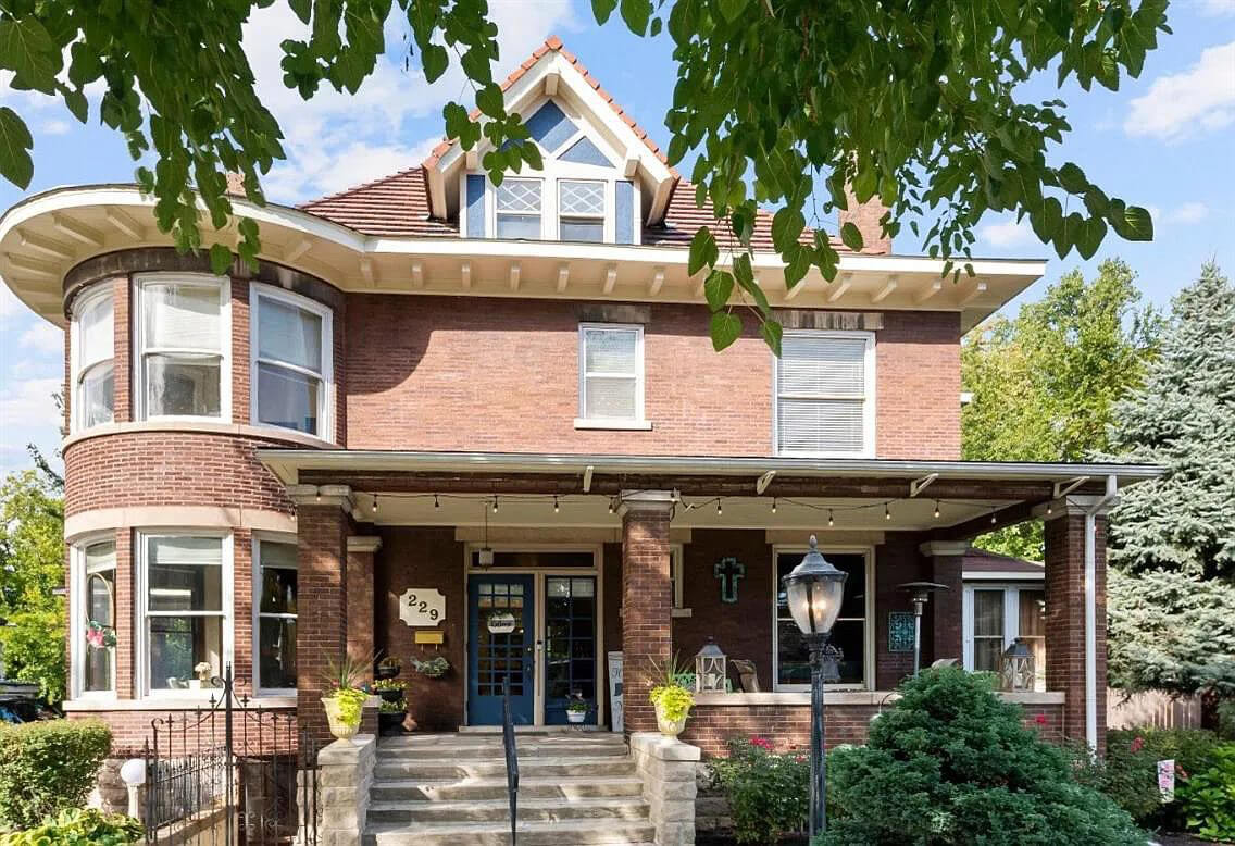 The house is a 3-story 5,526 square foot brick home featuring a turret on the second floor, seven bedrooms and seven baths. The house has a beamed ceiling and fireplace in the living room, as well as a sunroom and library on the first floor.