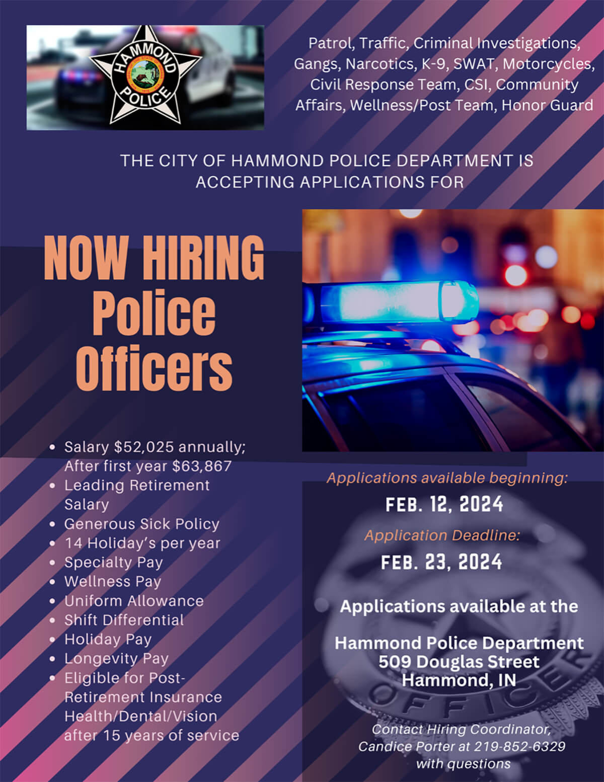 APPLICATIONS ARE AVAILABLE AT THE HAMMOND POLICE DEPARTMENT (509 DOUGLAS STREET) BETWEEN FEBRUARY 12, 2024 – FEBRUARY 23, 2024.